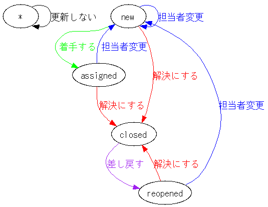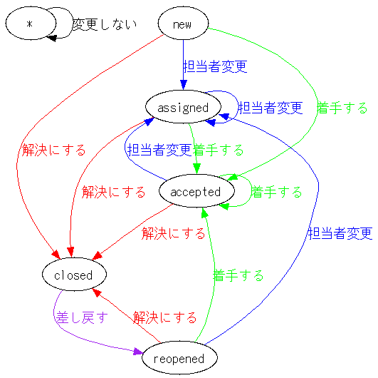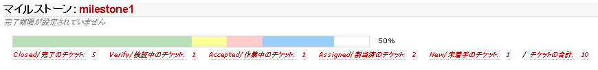vi /usr/share/trac/conf/trac.ini ---- [milestone-groups] closed = closed closed.label = closed/完了 closed.order = 1 closed.overall_completion = true closed.query_args = group=resolution verify = verify verify.css_class = yellow verify.label = verify/検証中 verify.order = 2 accepted = accepted,in_work accepted.css_class = red accepted.label = accepted/作業中 accepted.order = 3 assigned = assigned,reopened assigned.css_class = blue assigned.label = assigned/割当済 assigned.order = 4 new = new new.css_class = open new.label = new/未着手 new.order = 5 ---- service httpd graceful