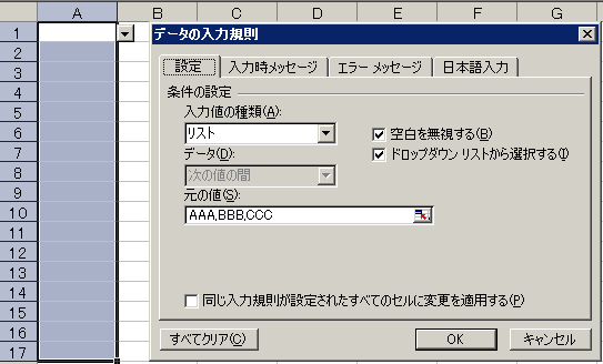 1. メニューから、「データ」->「入力規則」