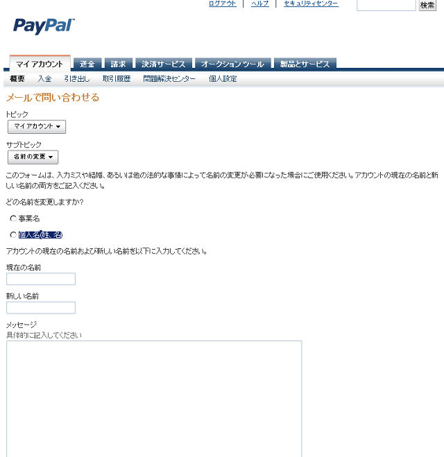 名前は自分で変更できないので、PayPalに依頼する必要がある。