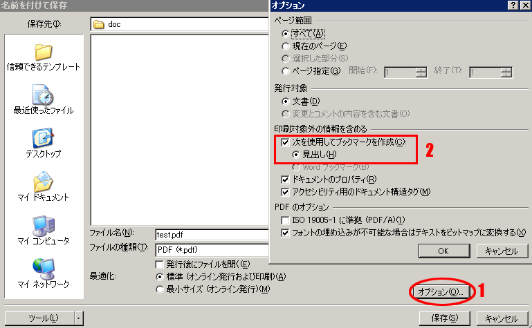 Word2007のPDF保存時に、「見出し」を「しおり」に変換する †