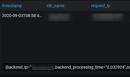 - ELBのlogだと、以下のようにヘッダと1行目は表示されるが、2行目以降がプルダウンになり、一覧で表示されない