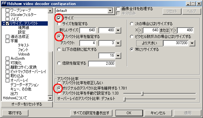 以下の設定で、ffdshow経由での再生時のみですが、4:3以外の動画再生時には上下に黒帯が挿入され、正しい縦横比で表示されるようになりました。